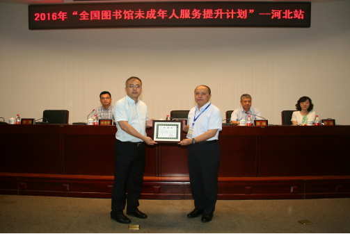 国家图书馆常务副馆长、中国图书馆学会副理事长陈力,河北省文化厅副巡视员梁扉出席开幕式并致辞。陈馆长介绍了全国图书馆未成年人服务提升计划举办的缘起、意义及取得的成就,对河北省各级图书馆未成年人服务工作给予了高度肯定,并对全体学员提出了期许。梁扉副巡视员在致辞中对国家图书馆、中图学会对河北省图书馆事业的关心与支持表示了感谢,并希望河北图书馆业界加强与京津及其他省区的交流协作。接下来,陈力馆长代表中图学会向河北省图书馆颁发了“全国图书馆未成年人服务提升计划示范基地”铭牌和感谢状,中图学会副秘书长仲岩向河北省图书馆学会颁发了感谢状。省文化厅公共文化处处长张雪芳主持了开幕式。